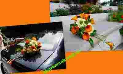 bukiet ślubny z pomarańczowej kantadeski z dodatkami zielonymi w mikrofonie