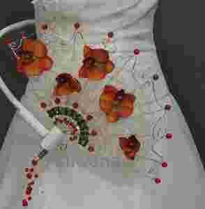 Wachlarz ślubny składa się ze stelaża z drutu aluminiowego, tasiemki szyfonowej, koralików akrylowych, kwiatów materiałowych, ozdobnego drucika.