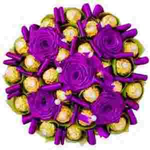 Bukiet Ferrero Rocher osadzony jest na stabilnej rączce i udekorowany wstążkami oraz kolorową flizeliną.
