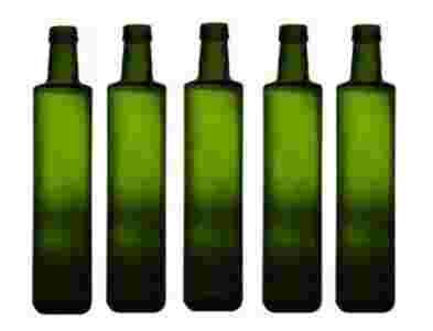 Szklana butelka wykonana w kolorze oliwkowym o ciekawym, ładnym wyglądzie.