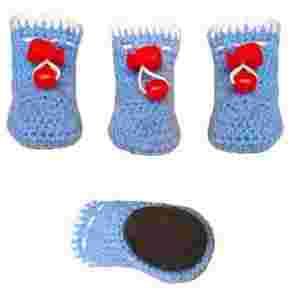 Przedmiotem aukcji jest komplet bucików dla czworonoga. Całość wykonana jest z włóczki w kolorze niebieskim z ozdobnym wykończeniem w kolorze białym, z czerwonymi stoperami. Buciki przed spadaniem z łapek zabezpieczają sznureczki do zaciskania za pomocą stopera.Komplecik wykonano pod specjalnym kątem, tak aby piesek mógł swobodnie stawiać łapki. Do spodu każdego bucika przymocowana jest skórzana "łatka", która zapobiega poślizgowi, przemakaniu, wycieraniu się oraz wychładzaniu łapek,