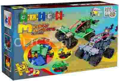 - 142 klocki CLICS - 4 klocki CLICS z otworem na oś - 23 osie rożnej długości - 3 klocki CLICS, światła - 2 kominy - 7 małych kół - 4 duże gumowe koła - 3 instrukcje - kalkomania