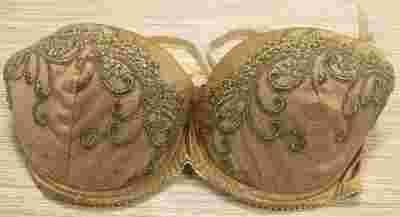 Biustonosz Caprice Crystal. Bardzo ładny i elegancki biustonosz PU w kolorze złota. Miseczki ozdobione są elegancką koronką w kolorze złota w górnej części wykończona drobnymi kwiatkami. Boki biustonosza są zrobione ze złotej satynki co dodaje temu biustonoszowi dodatkową elegancję. Ramiączka odpinane, na których są zdobne kokardki w kolorze zlotym. Między miseczkami również zdobna kokardka w kolorze złota. Zapięcie biustonosza dwustopniowe. Skład: 75% poliamid, 15% elastan, 10% inne.