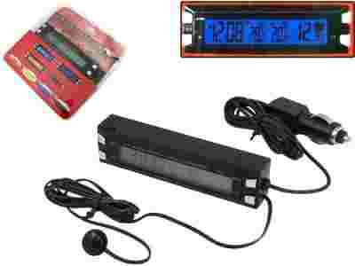 Fabrycznie nowy, wysokiej jakości elektroniczny termometr samochodowy z zegarkiem i pomiarem stopnia naładowowania akumulatora.