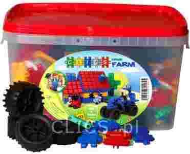 - 397 klocki CLICS - 5 klocki CLICS z otworami na oś - 10 osi różnej długości - 1 piramidka - 3 postacie CLICS - Zabawni farmerzy !!! - 1 komin - 12 małych kół - 2 duże, gumowe koła, średniej szerokości - 2 duże, gumowe koła - 2 plany budowy, maszyny rolnicze