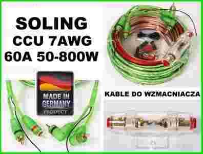 Bardzo dobry zestaw kabli do mocnego wzmacniacza 50-800W niemieckiej firmy SOLING. Kable klasy 7AWG przeznaczone do zasilania wzmacniaczy mocą do 800W wykonane w klasie CCU OFC (99,9 czysta miedź beztlenowa bez żadnych domieszek). W komplecie grube kable zasilające – prądowe, kabel 2RCA ekranowany z żyłą sterującą do włączania wzmacniacza REMOTE, kabel głośnikowy, porządny bezpiecznik typu AGU i akcesoria pokazane na zdjęciu. To jest najczęściej kupowany zestaw kabli w naszym sklepie, kupują je klienci indywidualnie, warsztaty car-audio i hurtownie. Nie było z nimi nigdy żadnych problemów ani reklamacji. Kable zasilające i sterujące wykonane z bardzo giętkiej linki miedzianej w mięciutkiej izolacji silikonowej, doskonale się układają w profilach. Nie będzie problemów przy ich przeciąganiu przez cały samochód. Całość zrobiona elegancko, profesjonalnie. Niemiecki Soling to gwarancja solidności. Należy również dodać, że kable są bardzo ładne i robią wrażenie. Silikonowa półprzeźroczysta zielonkawa izolacja aż kusi, żeby delikatnie podświetlić ją zieloną diodą LED. Profesjonalny niemiecki produkt.
