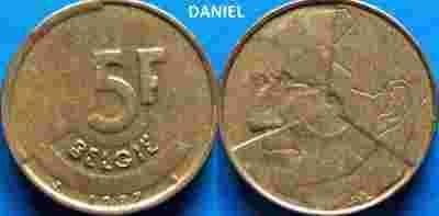 Przedmiotem sprzedaży jest 5 franków z lat1986-93 . Dostępne roczniki : odmiana Belgique :1986-87 , odmiana Belgie , 1987-88 i 1993 (przy wyborze rocznika proszę o kontakt) (była to moneta obiegowa) , z mosiądzu lub AluminioBrązu z Belgii ( dostępnych jest 9 sztuk ) , waga 5,5 grama . Stan monet : 3