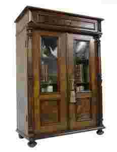 Przedmiotem aukcji jest prawdziwy antyk w postaci przepięknej biblioteki/witryny z XIX wieku. Mebelek wsparty jest na dwóch toczonych filarach, filary dodatkowo są kanelowane (wyfrezowane rowki wzdłuż filarów). Wnętrze czyściutkie fornirowane dębem co świadczy o wysokiej klasy warsztacie w którym powstała biblioteka. Na zewnątrz przepiękny specjalnie wyselekcjonowany fornir z orzecha. Zamki sprawne, wewnątrz trzy półki na których mieszczą się dość sporej wielkości książki jak i zastawy porcelanowe. Stan mebla jest wyśmienity zwłaszcza zważywszy, że powstał w drugiej połowie XIX wieku. Zapraszam do bogatej galerii zdjęć w wysokiej rozdzielczości która również pewną formą opisu. Do Biblioteki dodaję gratis górkę (nadstawkę) która moim zdaniem oryginalnie nie przynależała do w/w mebla ale oczywiście bardzo pasuje i całość razem fajnie się komponuje.