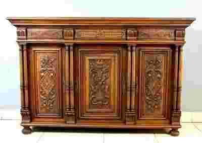 Mebel zamykany jest trzydrzwiowo, fronty drzwi posiadają wspaniałe rzeźbione girlandy i motywy renesansowe.Górny szeroki profilowany gzyms ozdobiono bogatymi ornamentami. Każde z drzwi przedzielono parą uroczychkolumien.