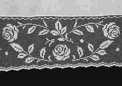 Sposób wykonania: Koronka filetowa, zwana również kołkową (ręcznie wykona siatka bawełniana na której ręcznie haftowane są misterne wzory) połączona z bawełnianą tkaniną