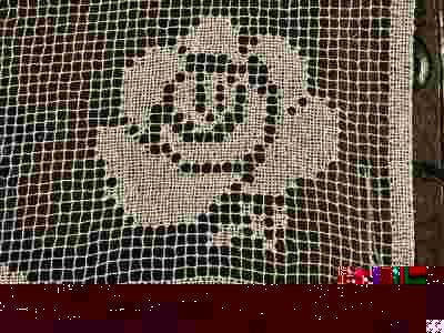 Sposób wykonania: Koronka filetowa, zwana również kołkową (ręcznie wykona siatka bawełniana na której ręcznie haftowane są misterne wzory)