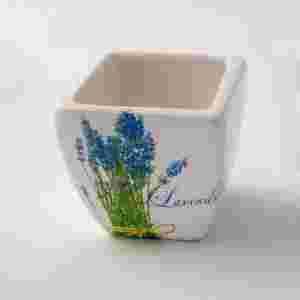 Kwadratowa ceramiczna osłonka na doniczkę. Zdobiona motywem lawendy.