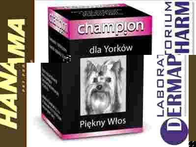 Champion Witaminy: Zestaw witamin i minerałów opracowany specjalnie dla psów rasy Yorkshire Terier. Zawiera cynk, biotynę, kwas pantotenowy oraz witaminy A i E. Regularne stosowanie preparatu zapewnia piękny błyszczący włos i zdrową skórę.