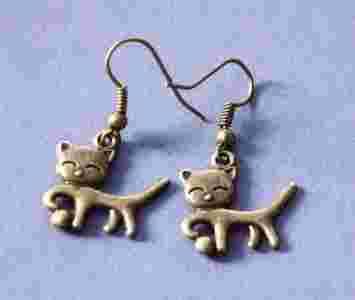 Kolczyki wykonane z metalu antyalergicznego, w kolorze starego złota. Z zawieszką w kształcie kota o wymiarach około 2cm. Całkowita długość kolczyków to około 3,5cm.