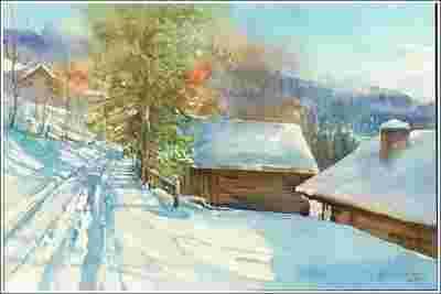 CHATY - ZIMA - ŚNIEG -GÓRY ---- Akwarela