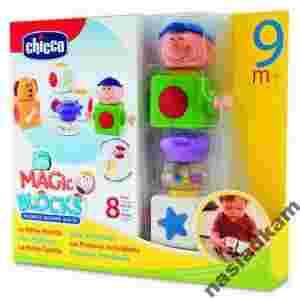 Chicco Pierwsze Klocki Numer kat. 67075 Magic Blocks to pierwsza linia konstrukcyjna zaprojektowana przez Chicco dla dzieci od 9 miesiąca życia. Klocki mają podwójny system łączenia, stworzony z myślą o zdolnościach motorycznych dzieci na różnych fazach wzrostu. Połączenie magnetyczne pozwala młodszym, mniej doświadczonym budowniczym w prosty sposób połączyć klocki ze sobą, natomiast możliwość układania klocków jeden na drugim pozwala dziecku zrealizować nieco bardziej przemyślane konstrukcje. Możliwość łączenia jest zaznaczona dwoma różnymi kolorami: czerwonym i żółtym, tak, żeby dziecko mogło odróżniać pomoc przy budowaniu. Zestaw 8 elementów, z których można stworzyć 4 zabawne małe zwierzątka. Lew i słoń mają różną fakturę dla stymulacji zmysłu dotyku. Brzęczące kuleczki w środku sprawiają, że budowanie jest jeszcze zabawniejsze. Czyścić tylko powierzchniowo. Myć wilgotną szmatką z dodatkiem mydła.