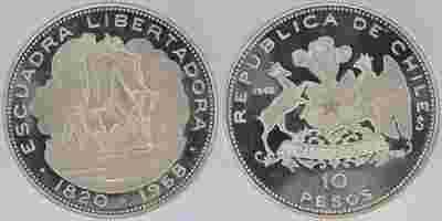 CHILE 10 PESOS Ag 1968 ESCUADRA LIBERTADORA RARE