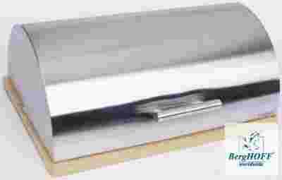 Stal nierdzewna, uchwyt ze stali nierdzewnej, podstawa drewniana, przeznaczony do przechowywania pieczywa.