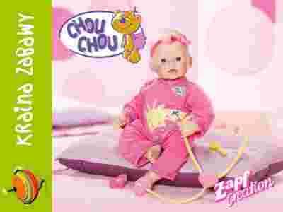 Chou Chou "Mamusiu, jestem chora" to wspaniała propozycja zabawy dla dziewczynek. Dzięki koncepcji Zapf Creation, dziewczynki będą mogły nie tylko pobawić się "w mamę", ale także zająć się maleństwem, jak prawdziwy lekarz. Urocza Chou Chou tym razem, podobnie, jak niemowlę, może zachorować. Funkcje, jakie posiada lalka sprawią, że choroba laleczki będzie wygladać niezwykle realnie. Dzięki stetoskopowi "mama - lekarz" posłucha, jak "dziecku" bije serduszko. W tym celu należy przystawić stetoskop do klatki piersiowej laleczki. Po naciśnięciu plecków lali, ta zaczna płakać, a jej policzki zaczynają się rumienić od gorączki. Choremu maleństwu należy bezwzględnie podać syropek, gdy dziewczynka to uczyni, Chou Chou poczuje się lepiej - z jej policzków zniknie rumieniec, a "temperatura się obniży". Smoczek uspokoi maleństwo. Zdrowe maleństwo jest szczęśliwe i radosne, laleczka się śmieje. Do zestawu dołączono smoczek - termometr, stetoskop, łyżeczkę.
