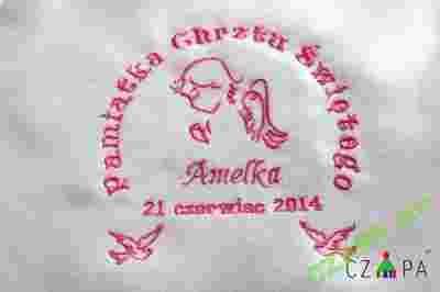 z wyhaftowanym wedle życzenia: motywem, imieniem i datą chrztu