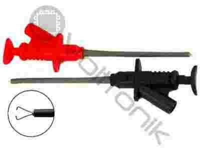 Chwytak pazurkowy z gniazdem bananowym 4mm w kolorze czarnym lub czerwonym. Końcówki mają chwytaki z drutu stalowego umożliwiające pewny i stabilny chwyt elementu o średnicy do 4mm. Chwytak osadzony jest na wysięgniku o długosci 90mm i średnicy 5mm co umożliwia chwyt elementu w trudno dostępnym miejscu. Rękojeść zaopatrzona jest w wygodny manipulator do chwytania i puszczania mierzonego elementu oraz posiada gniazdo typu banan pozwalające na wygodne podłączenie przewodów pomiarowych zakończonych "bananem". Oferowane końcówki pomiarowe umożliwiają przepływ prądu o wartości do 5A zaś materiał izolacji pozwala na pracę pod napięciem do 1000V (CAT.III). Po zakupie proszę się określić jakiego koloru ma być chwytak.