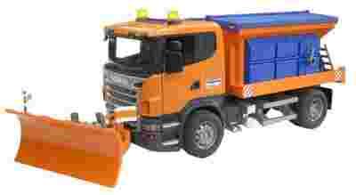 Model ciężarówki Scania R serwis zimowy. Przedni spychacz można podnosić i opuszczać, regulować kąt pracy w zakresie +/-30 stopni lub całkowicie zdemontować. Posypywarkę wyposażono w otwierany zbiornik do zasypywania piaskiem oraz składany do transportu moduł rozsypujący. Obok tarczy posypywarki znajduje się składana drabinka Przednie okno kabiny ciężarówki wykonano z wysokiej jakości przezroczystego poliwęglanu. Drzwi kabiny można otwierać, a zewnętrzne lusterka składać. Gigantyczne rozmiary zabawki i ogromna ilość funkcji połączona z maksymalną dbałością o szczegóły wykonania dostarczą małym drogowcom niezapomnianych wrażeń.