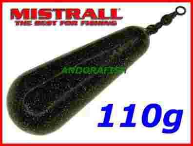 Ciężarek karpiowy Mistrall longcast 110g / brązowy kamuflaż Wysokiej jakości ciężarek karpiowy firmy Mistrall przeznaczony do obciążania zestawów gruntowych. Kształt ciężarka oraz ciemno brązowy kolor idealnie maskują go na dnie łowiska, dzięki czemu jest nie widoczny dla ryb żerujących w pobliżu zestawu. Wydłużony i opływowy kształt ciężarka umożliwia znacznie dalsze wyrzuty, niż w przypadku tradycyjnych ciężarków. Ciężarek wykonany jest z wysokiej jakości plastycznego ołowiu pokrytego utwardzoną, odporną na uszkodzenia mechaniczne farbą proszkową. Zaopatrzony jest w mocny, klasyczny krętlik nie kaleczący żyłki, typu Barrlel Swivel. Wysoką jakość produktu gwarantuje firma Mistrall !!! Specyfikacja ciężarka