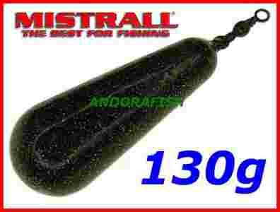 Ciężarek karpiowy Mistrall longcast 130g / brązowy kamuflaż Wysokiej jakości ciężarek karpiowy firmy Mistrall przeznaczony do obciążania zestawów gruntowych. Kształt ciężarka oraz ciemno brązowy kolor idealnie maskują go na dnie łowiska, dzięki czemu jest nie widoczny dla ryb żerujących w pobliżu zestawu. Wydłużony i opływowy kształt ciężarka umożliwia znacznie dalsze wyrzuty, niż w przypadku tradycyjnych ciężarków. Ciężarek wykonany jest z wysokiej jakości plastycznego ołowiu pokrytego utwardzoną, odporną na uszkodzenia mechaniczne farbą proszkową. Zaopatrzony jest w mocny, klasyczny krętlik nie kaleczący żyłki, typu Barrlel Swivel. Wysoką jakość produktu gwarantuje firma Mistrall !!! Specyfikacja ciężarka