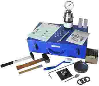butla ciśnieniowa, manometr, nakrętki uszczelniające, waga sprężynowa do 100g (pomoc odczytu przy 0, 20, 50 i 100g, max. błąd <0,3%), młotek 360g, młotek 1000g, dłuto, dłuto płaskie, metalowa miseczka, stalowe kulki, łyżka, 20 szt. ampułek karbidowych, 20g materiał testowy.