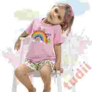 Przedmiotem aukcji jest piżamka dziewczęca z firmy Cornette. Piękne kolory i świetna jakość zapewni komfortowy sen. Bluzeczka z krótkim rękawem i krótkimi spodnie na gumce w pasie. Bluzeczka z nadrukiem z przodu, spodnie w ptaszki.