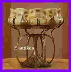 Niebywale efektowna duża patera w stylu secesyjnym. Misę wykonaną z krakelurowej porcelany o pistacjowym odcieniu dekorują ręcznie malowane wzory z żółtych kwiatów. Naczynie osadzone jest na finezyjnej podstawie z brązu o doskonale wkomponowanych w konstrukcję ozdobnych liściach. Stan przedmiotu bardzo dobry, bez uszkodzeń.