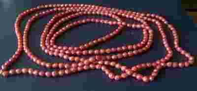 Maleńkie fasetowane kamyki jaśniutko rubinowe. Ślicznie połyskują. Bardzo efektowne. Chyba plastykowe bo bardzo leciutkie. Super gatunek. Długość to dwa metry i 25cm. Dostałam je w latach 70 tych od ciotki z Anglii. Służyły mi na wiele różnych sposobów. Wielokrotnie nawlekane na duże, małe i maleńkie długości. Nic nie było więc się kombinowało. Aktualnie nawleczone są na nitkę i od wielu, wielu lat czekają na nową młodą pomysłową właścicielkę.