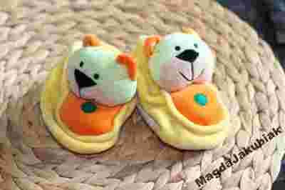 Na tej aukcji śliczne bamboszki dla maluszka. Idealne na pierwsze dni życia. Mięciutkie i z grzechotkami.