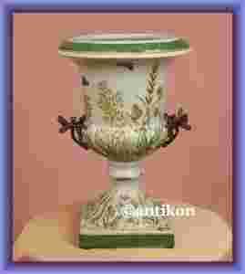 Klasycystyczny kształt wazonu przyciąga spojrzenia a jego stonowane pastelowe barwy doskonale sprawdzą się w każdym domu. Ważki z brązu wspaniale wpisują się w motyw łączki ręcznie malowany na porcelanie. Stan przedmiotu bardzo dobry.