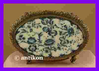 Wspaniała taca wykonana z jasnej porcelany o krakelurowym szkliwie. Ozdobiona jest miśnieńskim wzorem cebulowym o kobaltowej barwie. Naczynie posiada dekoracyjne okucie z brązu o motywach kwiatowych a jego nóżki tworzą cztery figurki uroczych amorków. Przedmiot sygnowany na spodzie. Stan bardzo dobry.