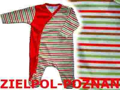 Przedmiotem aukcji jest bawełniany pajacyk z czerwoną lamówką w rozmiarze 68.