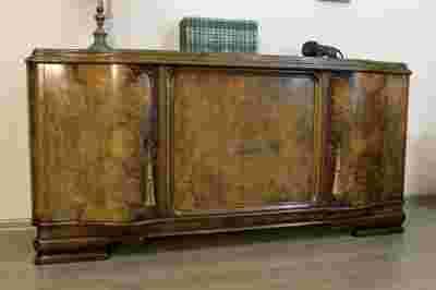 Bufet prezentuje się doskonale .. Bogate usłojenie robi duże wrażenie. Mebel wznosi się na finezyjnej, falistej podstawie z elementami rzeźbień. Skrzydła eksponują piękną, czeczotę orzechową dekorowaną wyrazistymi wolutami roślinnymi.