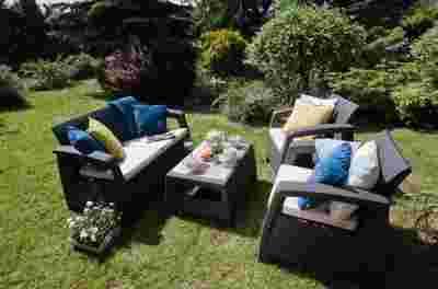 Meble są bezobsługowe, wykonane z tworzyw sztucznych odpornych na wpływy atmosferyczne i promienie UV, są wyjątkowo trwałe i mogą być pozostawione na zewnątrz przez cały rok.