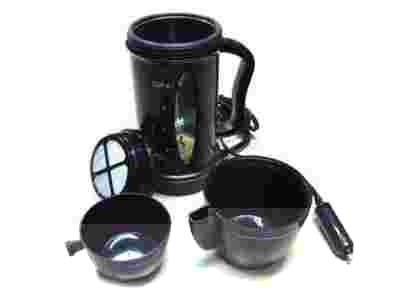 Czajnik samochodowy zasilany napięciem 12V. Czajnik wyposażony jest we wtyczkę zapalniczki dwa kubki podstawkę i sitko. Pojemność czajnika wynosi 0 8l co wystarczy na zaparzenie 4 kubków. POLECAMY!