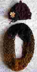 Witam na mojej aukcji i proponuję ciekawy, nowy, niepowtarzalny komplet - czapka i komin. Wykonany na szydełku z średniej grubości włóczki - ozdobnej bukli i akrylu melanżowej w kolorach czerni z brązem - komin czapka - brąz/różnorodnym ciekawym ażurem. Dodatkiem jest dopinana kwiatowa aplikacja. Oryginalny niepowtarzalny zestaw komplecik w przystępnej cenie wspaniale się prezentuje - polecam i zapraszam na inne moje aukcje.