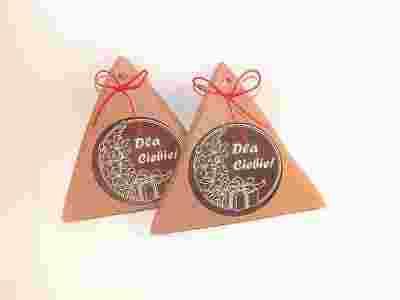 * kartonik w kształcie trójkąta z okienkiem o wymiarach: 14*14*14 cm. Kolorystyka: biały i w kolorze naturalnego ekologicznego brązu, ozdobiony subtelna wstążką.