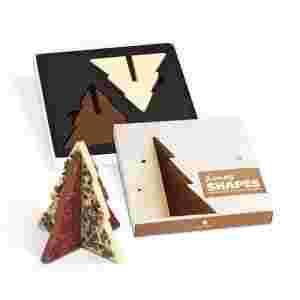 W świątecznym kartoniku o ciekawej fakturze zamknęliśmy czekoladowe elementy wykonane z czekolady mlecznej, i białej, które po połączeniu tworzą przestrzenną figurkę - choinkę. Każda część choinki została udekorowana pysznymi dodatkami takimi jak migdały, cynamon czy rozkruszone ziarno kakaowca.