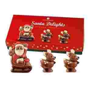 Zaprzęg Świętego Mikołaja w pięknym świątecznym opakowaniu ozdobionym gwiazdkami i podobizną figurek. W skład zestawu wchodzą czekoladowy Mikołaj z saniami i dwa reniferki. Wyjątkowe figurki to esencja smaku najlepszej jakości mlecznej czekolady z dodatkiem czekolady białej i deserowej.
