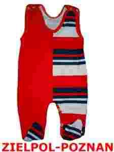 Przedmiotem aukcji jest czerwony śpioszek w paseczki rozpinany w kroku w rozmiarze 68.