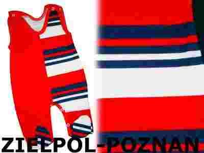 Przedmiotem aukcji jest czerwony śpioszek w paseczki rozpinany w kroku w rozmiarze 68.