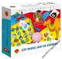 OPIS GRY: W grze "Czy wiesz jaki to zwierz?" wygrywa ten, kto najszybciej odnajdzie właściwy obrazek (spośród 96 leżących na stole) z fragmentem zwierzątka przedstawionego na polu, na którym stanie pionek. Podczas zabawy ćwiczy się koncentrację, refleks i spostrzegawczość. PUDEŁKO ZAWIERA: plansza do gry 96 tabliczek z obrazkami 1 pionek kostka do gry 60 żetonów instrukcja