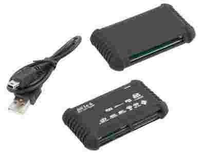 Uniwersalny czytnik kart pamięci All in One podłączany do komputera za pomocą dołączonego kabla USB.