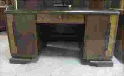Dębowe biurko Art Deco po renowacji. Przód drzwiczek oraz szuflady ozdobione fornirem orzechowym. Z lewej części biurka jednostronnego (przyściennego) trzy szuflady, natomiast z prawej dwie pojemne półki.