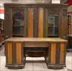 Komplet mebli gabinetowych z pierwszej połowy XX wieku. Biblioteka oraz biurko, bo o nich mowa, wykonane w dębie z pionowymi orzechowymi wstawkami między którymi znajdują się snycerskie elementy zdobnicze. Szyby fazowane, wnętrze biblioteki z dziewięcioma półkami - po trzy w każdej z części mebla, pod każdą z nich znajduje się jedna szuflada. Biurko z dwoma szafkami, w prawej trzy szuflady, w lewej jedna - w centralnej części również jedna szuflada.
