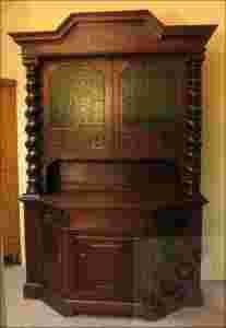 Dębowy kredens z przepięknie toczonymi, spiralnymi kolumnami z końca XIX wieku. Drzwi w górnej części mebla oszklone kolorowym szkłem (butelkowa zieleń). Na szybach szprosy oraz delikatna snycerka zdobiąca mebel. Wysuwany blat a pod nim trzy szuflady podnoszące funkcjonalność mebla. Ozdobne okucia zamków.